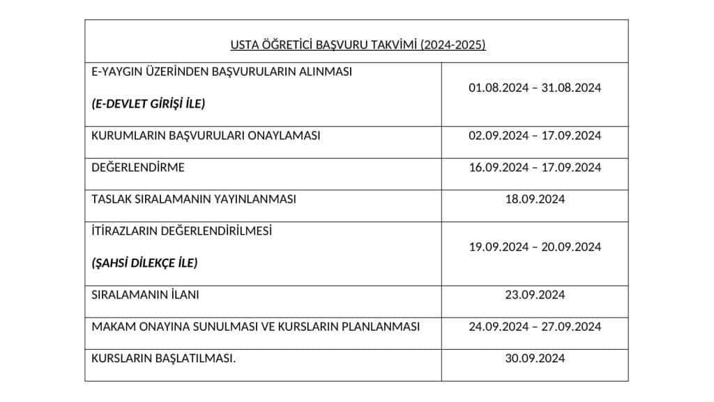 USTA ÖĞRETİCİ BAŞVURU TAKVİMİ (2024-2025)